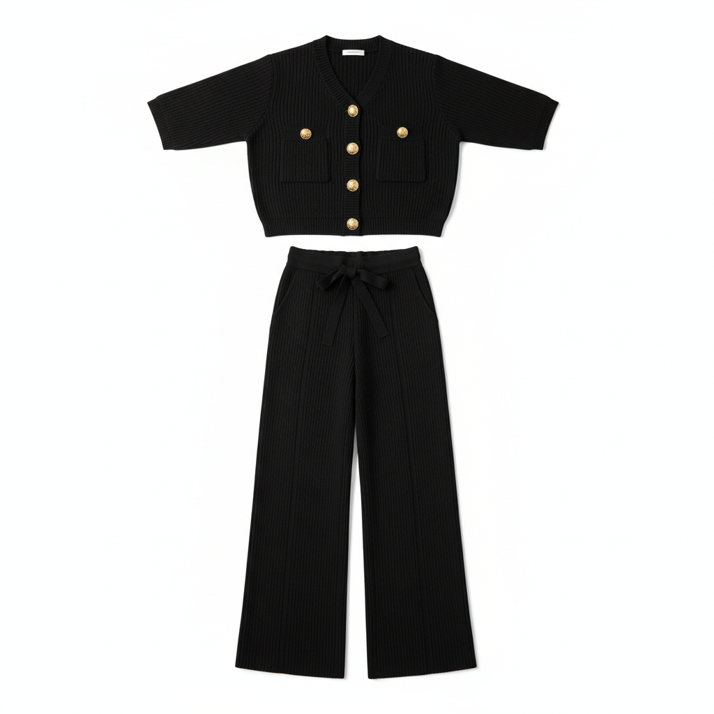 The perfect everyday top. A black short-sleeve knitted design featuring elegant gold button details — ideal for pairing with our ‘LORO’ trousers in black.